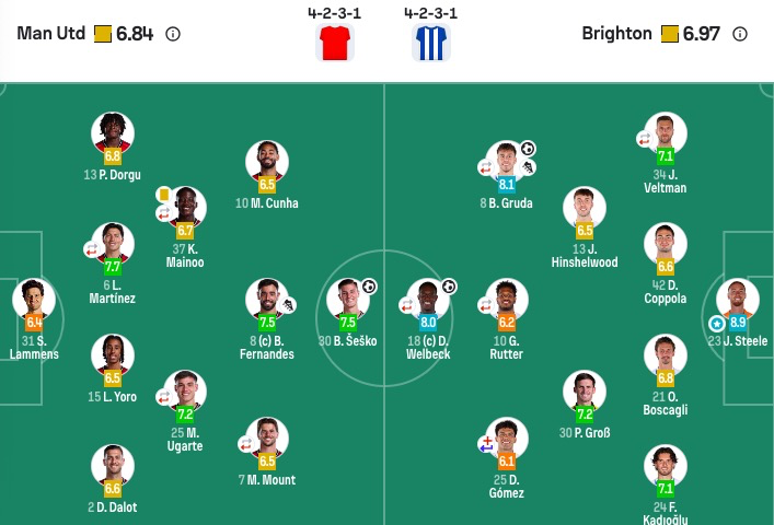 布莱顿首发:23-斯蒂尔、21-博斯卡利、24-卡迪奥卢、34-维尔特曼(77’ 26-阿亚里)、42-库博拉、8-格鲁达、13-辛谢尔伍德、25-迭戈·戈麦斯(77’ 6-范赫克)、30-格罗斯、10-鲁特尔(83’ 19-科斯托拉斯)、18-维尔贝克(78’ 22-三笘薰)